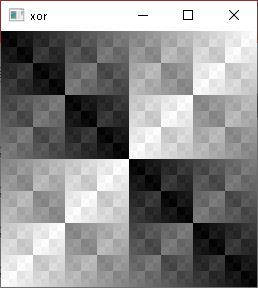 HL9>AWin *w = aOpenWin(256, 256, "xor"); for (j = 0; j < 256; j++) { for (i = 0; i < 256; i++) { aSetPix(w, i, j, 0x010101 * (i ^ j)); }}